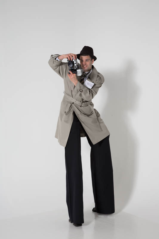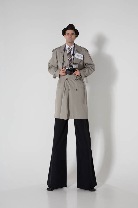 This costume is ideal for birthday parties or themed events. The costume is versatile and will work at many corporate or private events. Please get in touch using the contact us page if you would like to enquire about booking me and making use or my Press / Paparazzi stilt costume.