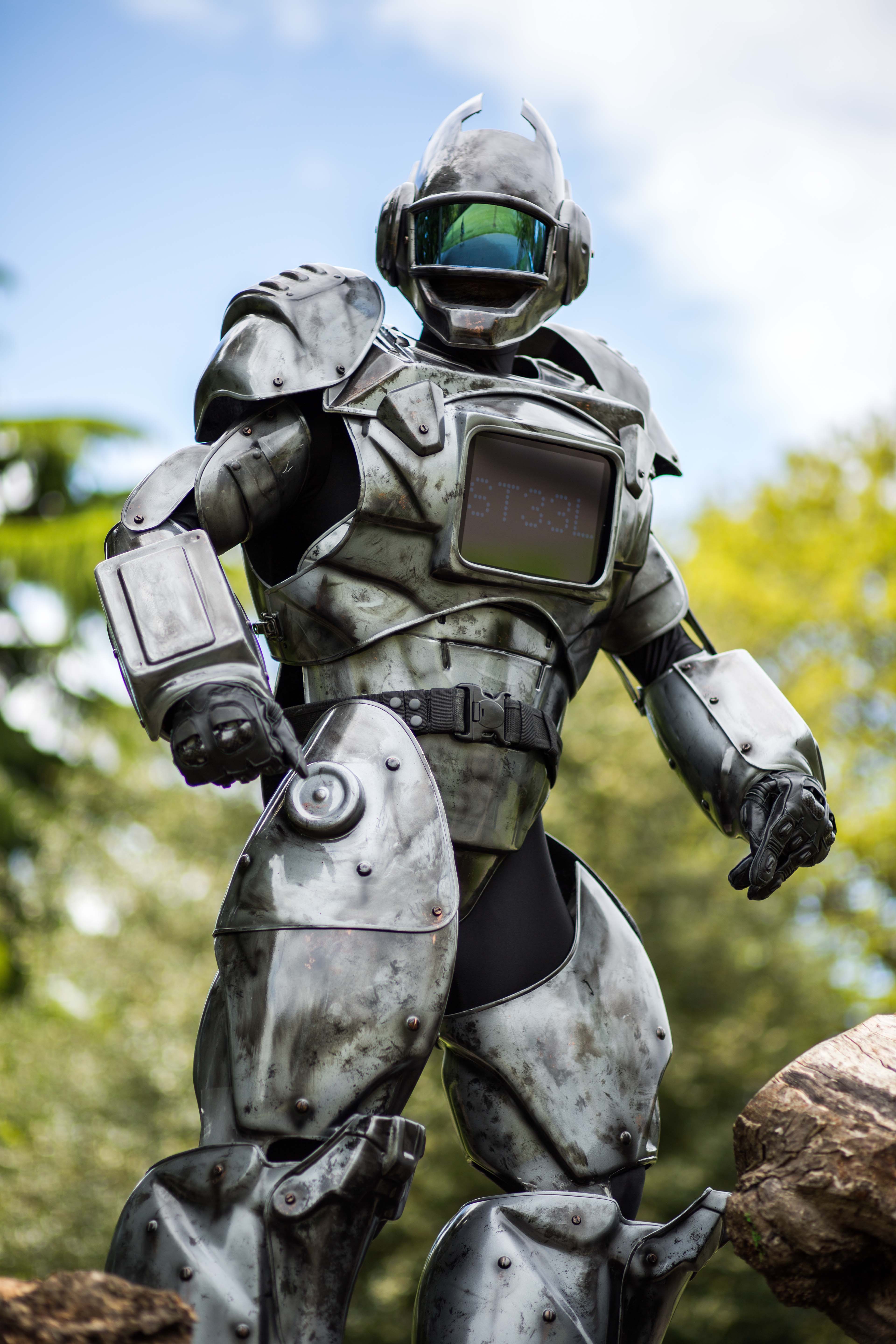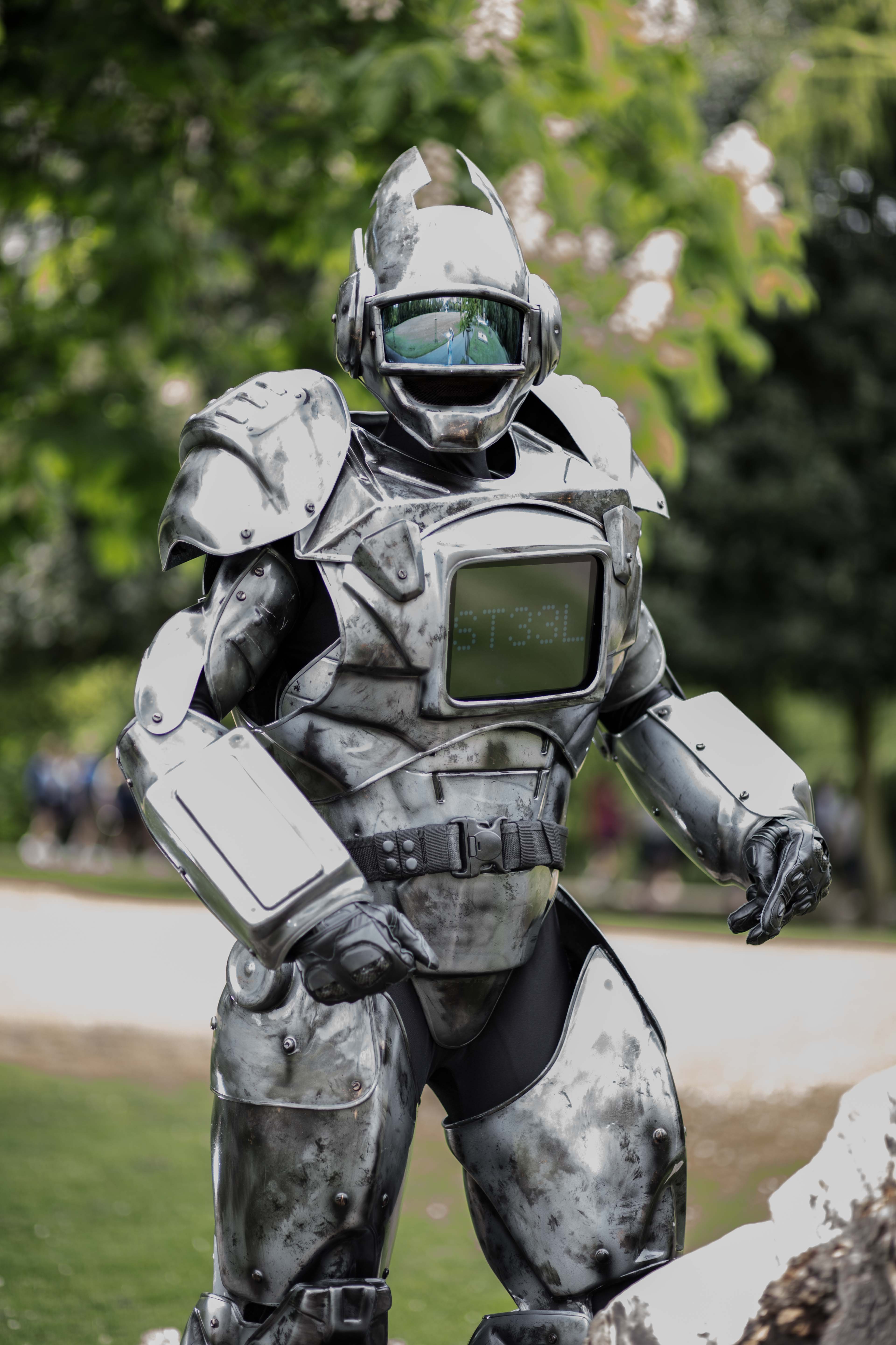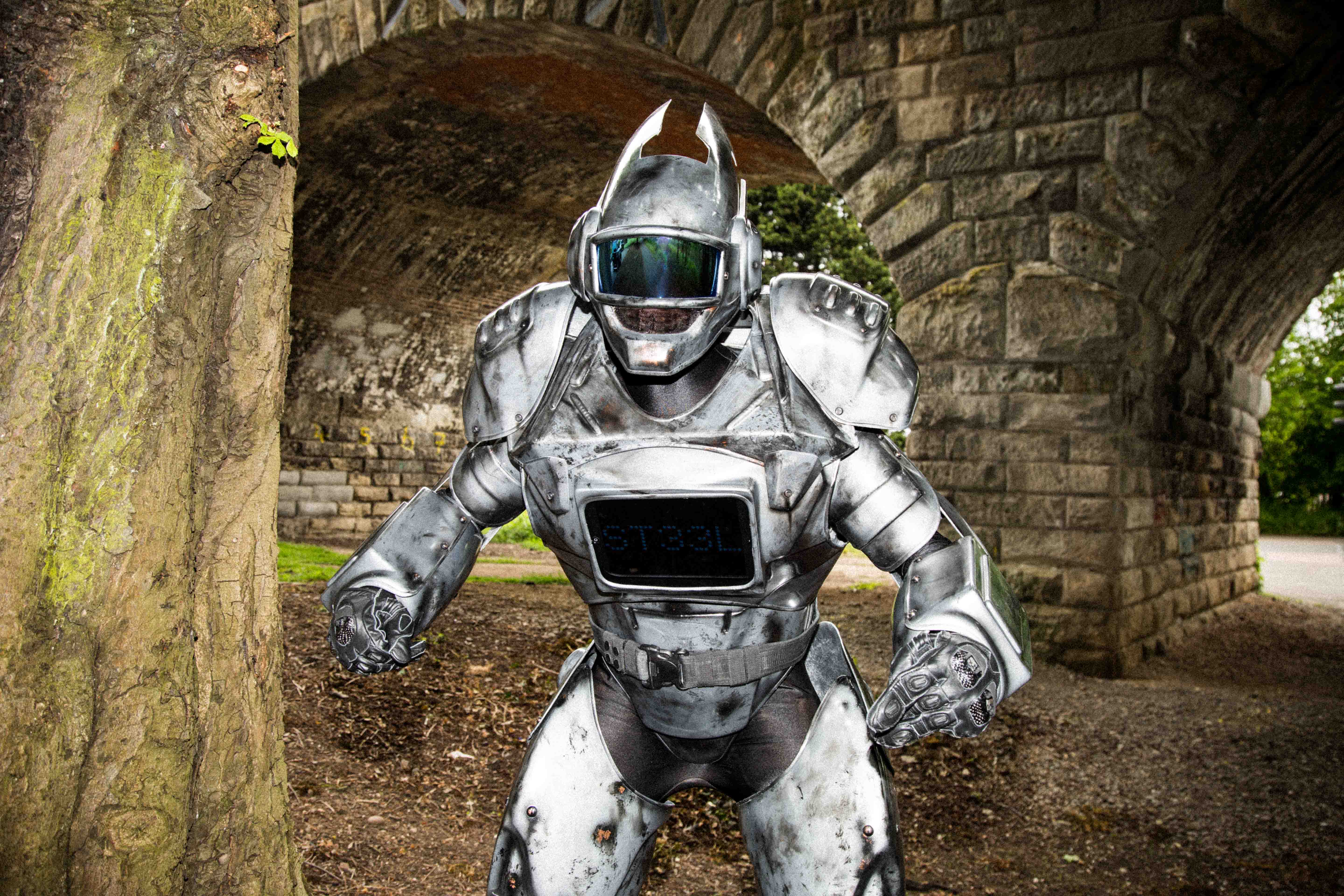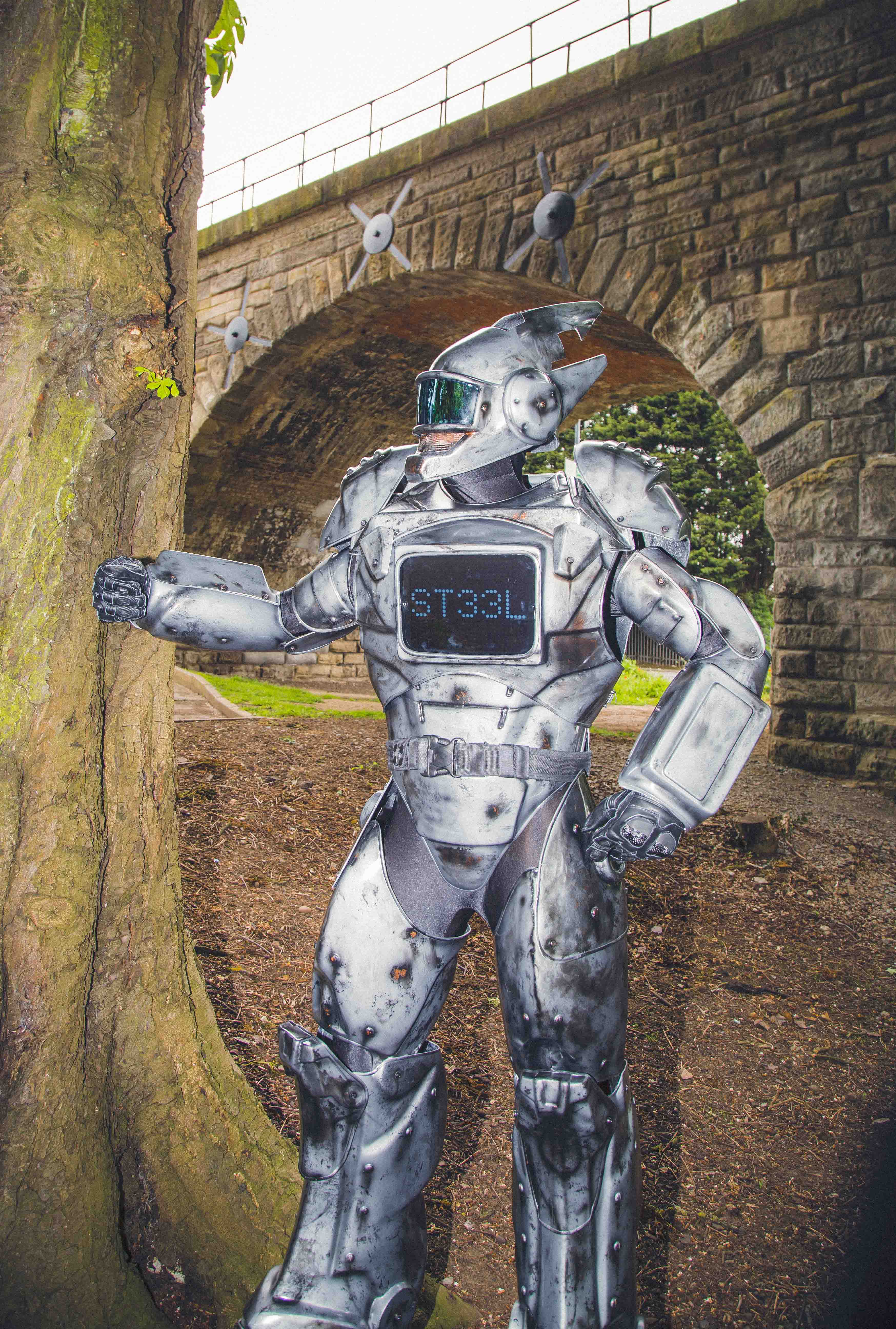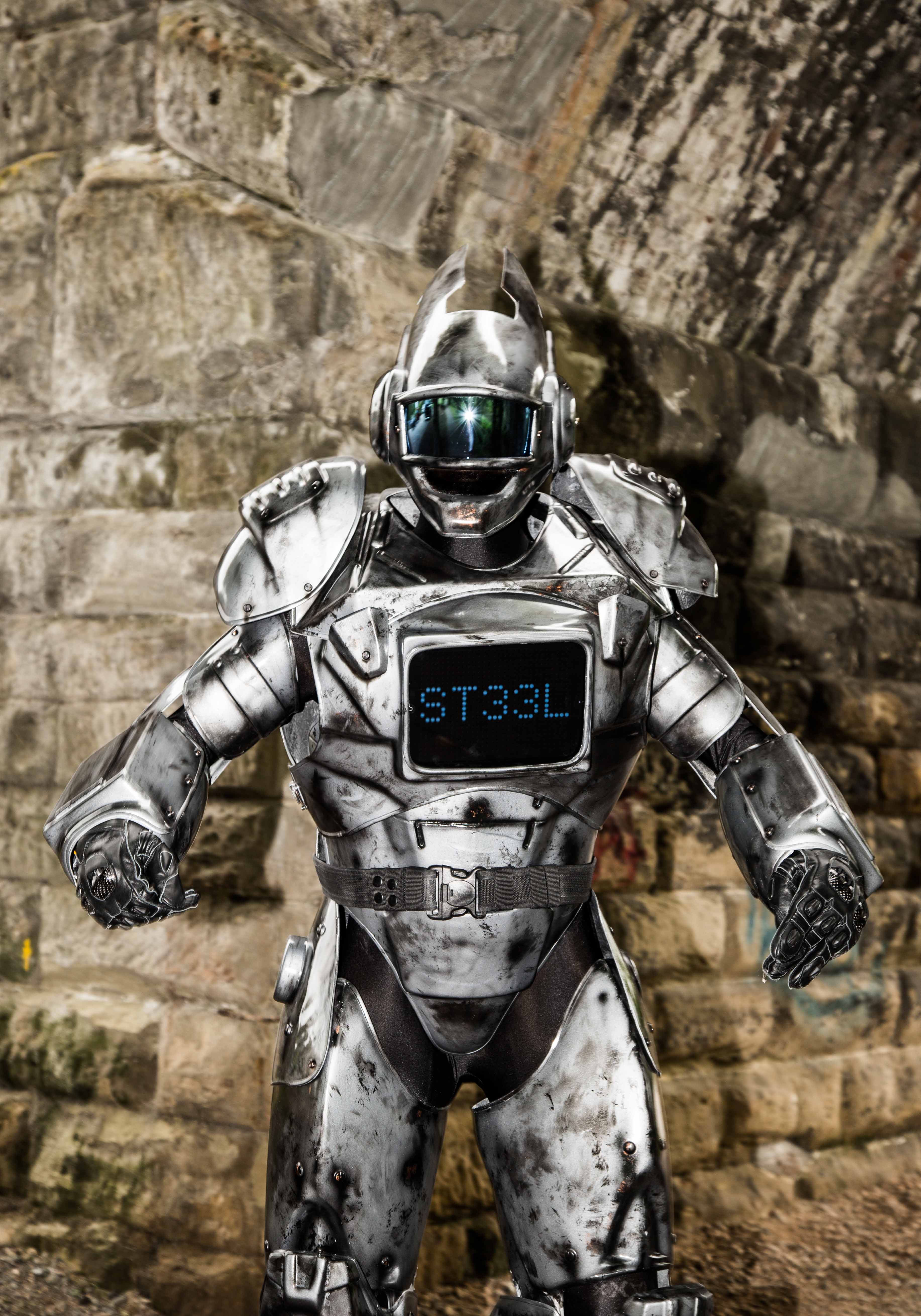 This custom made suit is ideal for events, parties or promotional work. When I become ST33L I am fully equipped with an iPad which can have a custom message or a video playing.